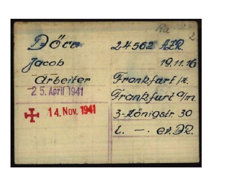 Jacob Dörr (geb. 1916) war erst am 25. April 1941 von seiner Geburtsstadt Frankfurt in das KZ Dachau verschleppt worden und wurde dort mit der Häftlingsnummer 24562 als „Asozialer“, d.h. „AZR“-Häftling von der Lagerverwaltung registriert. Im Außenlager Radolfzell galt er allerdings als „politischer Vorbeugungshäftling“. Er wurde von einem SS-Wachposten erschossen, nachdem seine Mütze hinter die Postenkette geworfen worden war und er den Befehl erhielt, die Mütze wieder zu holen. Seine Leiche wurde noch am Tag der Ermordung am 11. November 1941 im Krematorium Konstanz eingeäschert.