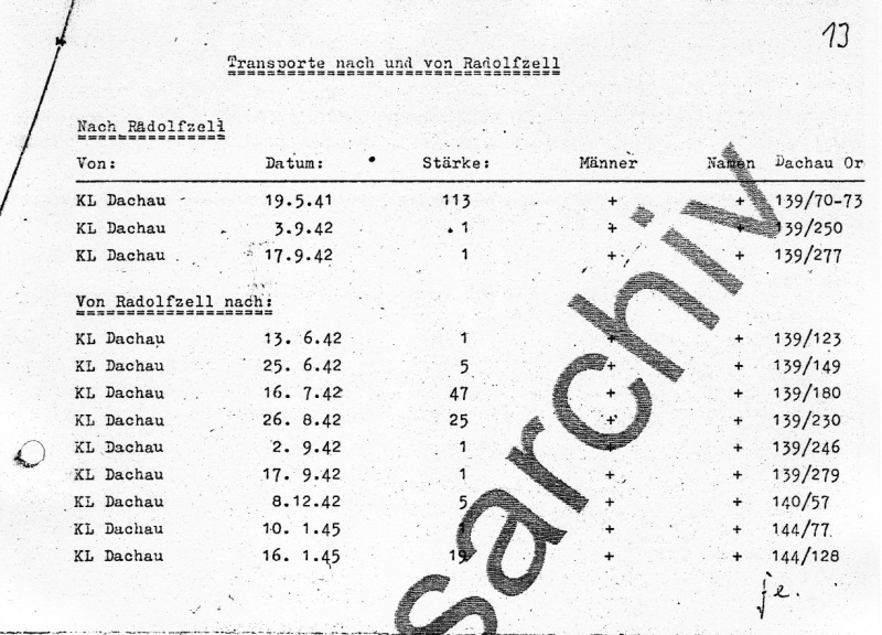 Im KZ-Außenkommando Radolfzell kam es 1941-1943 zu mehreren Tötungen von KZ-Häftlingen4 , von denen namentlich zwei durch archivalische Dokumente aus Arolsen, Freiburg, Dachau und Radolfzell nachzuweisen sind; im Jargon der Täter wurden die KZ-Häftlinge „auf der Flucht erschossen“ bzw. kamen bei einem „Unfall“ ums Leben: