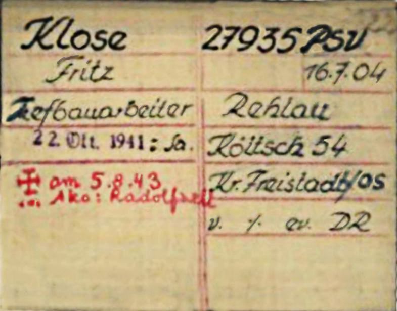 Fritz Klose (geb. 16.7.1904) aus Rehlau, Oberschlesien, seit 21.09.1940 im KZ Sachsenhausen in „Vorbeugehaft“ und in der Strafkompanie („SK“)- Häftlingskategorie: „BV/Sittl“ (=„Berufsverbrecher/ Sittlichkeitsverbrecher“5 - und vmtl. wegen TBC-Erkrankung mehrmals im Krankenbau, war am 21./22. Oktober 1941 von Sachsenhausen nach Dachau überstellt worden und kam dort in den TBC-Block.