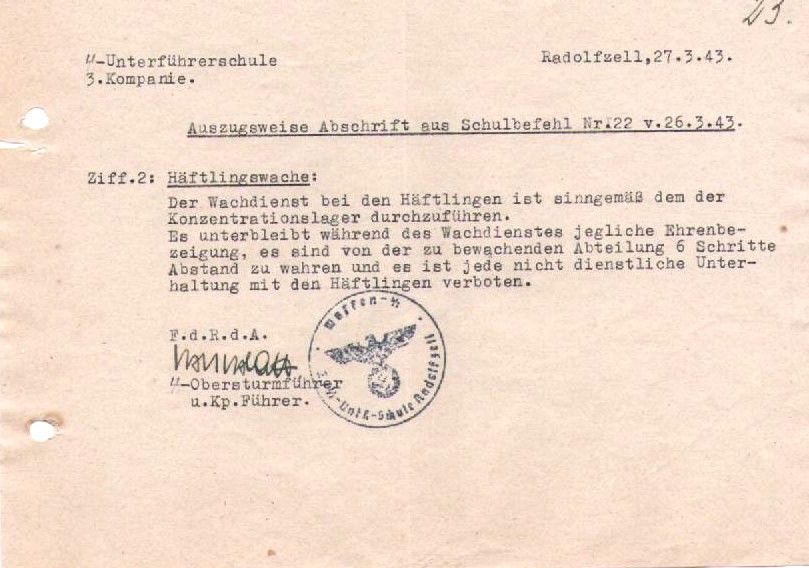 "Der Wachdienst bei den Häftlingen ist sinngemäß dem der Konzentrationslager durchzuführen." Abschrift aus USR-Schulbefehl Nr. 22 v. 26. März 1943. Gez. SS-Obersturmführer und Kompanieführer (Arthur) Burzlaff. BArch, MA Freiburg.