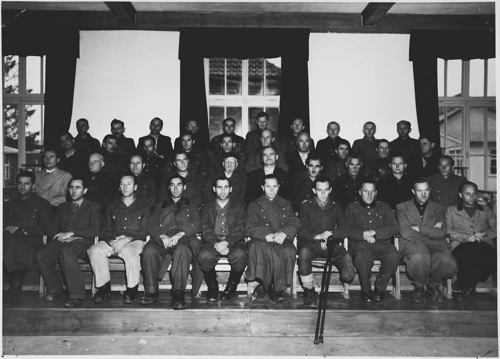 Die 40 Angeklagten im Dachau-Hauptprozess, November 1945.