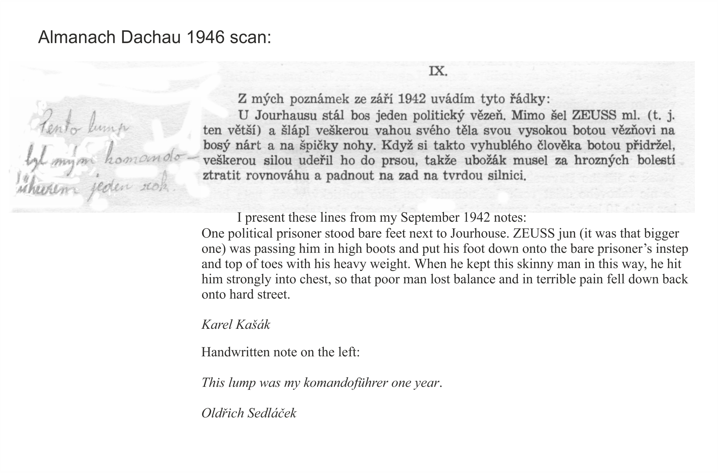 Anmerkung: Josef Seuß (1906) hatte einen um ein Jahr jüngeren Bruder, Wolfgang Seuß (1907-1979), der von 1933 bis zur gemeinsamen Versetzung nach Natzweiler 1942 ebenfalls zum ersten Wachpersonal in Dachau gehörte und dort wegen seiner Grausamkeiten nicht weniger gefürchtet war, weshalb es in gerichtlichen Zeugenaussagen und in Erinnerungstexten ehemaliger Dachau-Häftlinge mitunter zu Verwechslungen der beiden Brüder kam. Hinsichtlich der Körpergröße war Josef Seuß der "größere" , so dass es hier offenbleiben muss, welcher der beiden SS-Brüder im September 1942 von Kásak beschrieben wird: der jüngere Wolfang Seuß oder der größere Josef Seuß. Privatexemplar von Oldřich Sedláček. Privatbesitz Jiří Sedláček, Kladno.