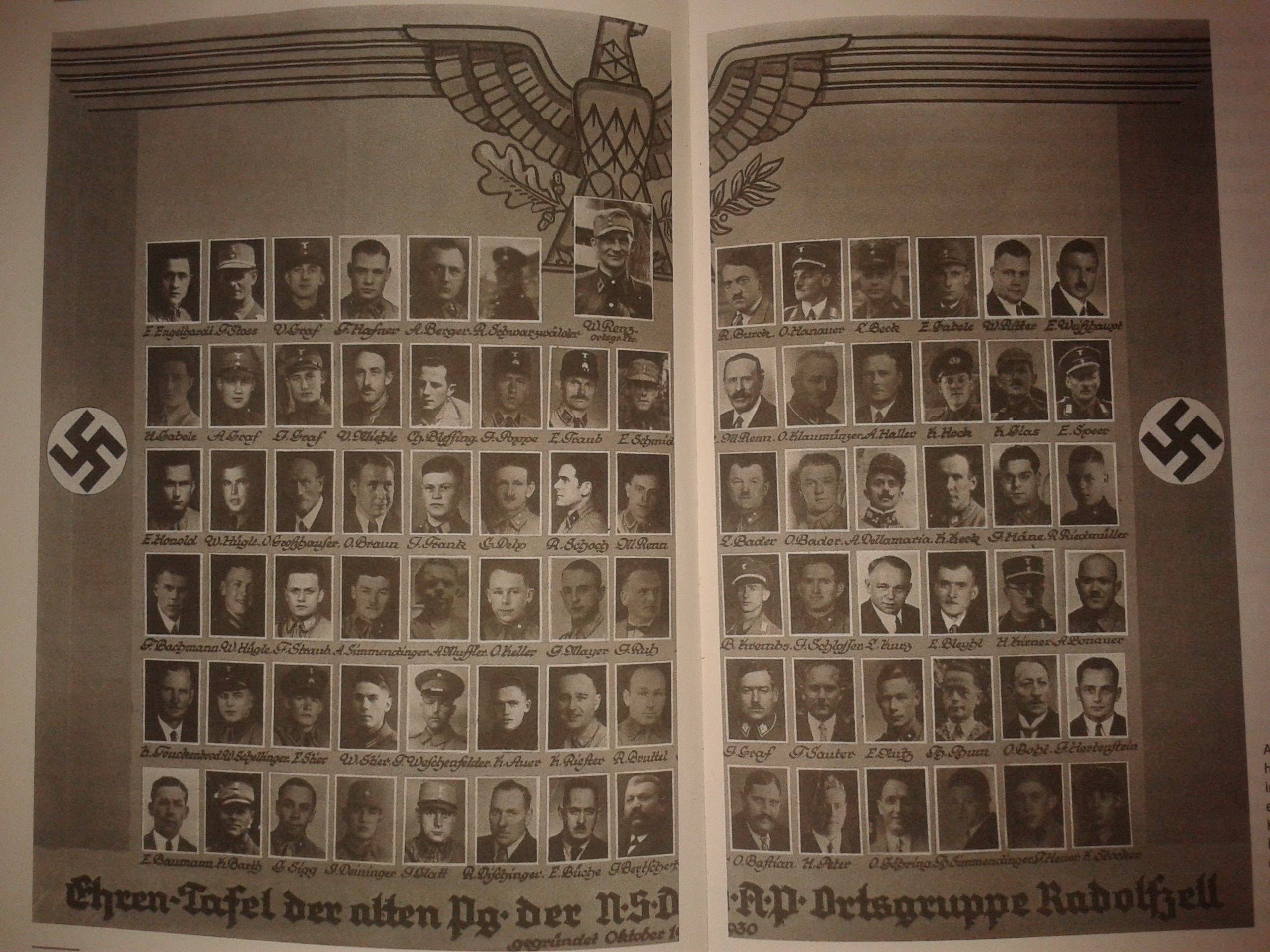 „Ehrentafel der alten PG der NSDAP-Ortsgruppe Radolfzell, Oktober 1930“; angefertigt 1933.1 Von links nach rechts, oben nach unten: E. Engelhardt, Friedrich Stoß, Viktor Graf (SA), Franz Hafner (SA), A. Berger, Rudolf Schwarzwälder (SS), Willy Renz (Ortsgruppenleiter), Richard Burk2 , Otto Hanauer, Ludwig Beck (SA), Egon Gabele, Willy Ritter, Ernst Weißhaupt | Hermann Gabele, A. Graf (SA), Johann Graf (SA), Vinzenz Miehle, Ch. Blessing, J. Poppe (SS), Emil Traub (SS), Eduard Schmidt, M. Renn, Oskar Klaumünzer, A. Haller, K. Hock, K. Glas, Eugen Speer | Emil Honold, W. Hügle, Otto Großhanser, Otto Braun, J. Frank, Georg Delp (SA), Rudolf Schoch (SA), Matthäus Renn (SA), Leo Bader (SA), Otto Bader, Alois Dellamaria, Karl Keck, Josef Häne, R. Riedmüller | Fritz Bachmann, W. Hügle, F. Straub (SA), Anton Simmendinger (SA), Anton Muffler, O. Keller (SA), Josef Mayer, Josef Ruh, Berthold Krembs, Josef Schlosser (SA), Ludwig Kurz, Ernst Bleyhl, Hermann Kirner (SA), Adolf Bonauer | Karl Truckenbrod, W. Schellinger (SS), E. Stier (SS), W. Stier, Franz Weschenfelder, K. Auer, Karl Riester (SA), Richard Bruttel, Johann Graf, Franz Sauter, E. Nutz, Theodor Thum, Oskar Bohl, Johann Hertenstein | E. Baumann, K. Barth (SS), G. Sigg (SA), Josef Deininger, Josef (Joseph) Heinrich Glatt (SA), Reinhard Dischinger, Ernst Büche, J. Bertsche, Otto Bastian, H. Peter, O. Göhring, Th. Simmendinger, F. Heuer, Karl Stocker (SA).3
