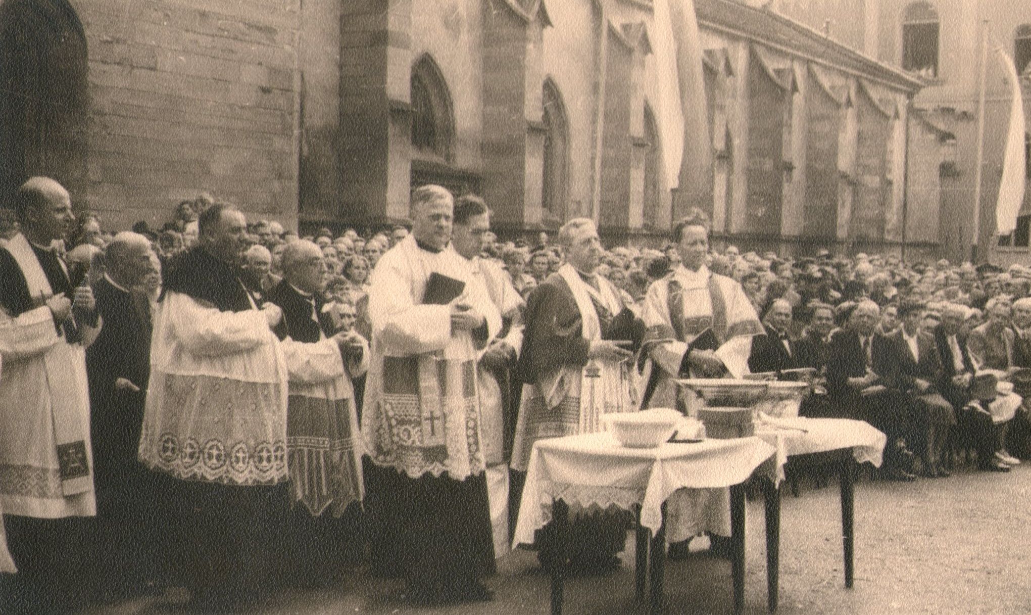 Klerikale "Entlastung" - Stadtpfarrer Josef Zuber (links am Tisch), Karl Ruby (rechts), in der Mitte Generalvikar Simon Hirt, bei einer Glockenweihe am Hausherrensonntag 1953. Zeitgenössische Fotokarte. Fotoarchiv Markus Wolter.