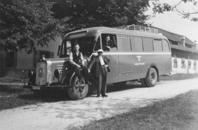 Einer von drei Bussen - hier noch in der ursprünglichen roten Farbe und mit dem Signet der Reichspost - der als Tarnorganisation eingerichteten "Gemeinnützigen Krankentransport GmbH (Gekrat), mit denen pro Transport durchschnittlich 75 Patient/innen von den Pflegeeinrichtungen nach Grafeneck gebracht wurden. Diese Zahl entsprach der "Kapazität" der dortigen Gaskammer. Personal der Gekrat, Wirtschaftsgebäude Grafeneck, 1940. Fotografie: Gedenkstätte Grafeneck.