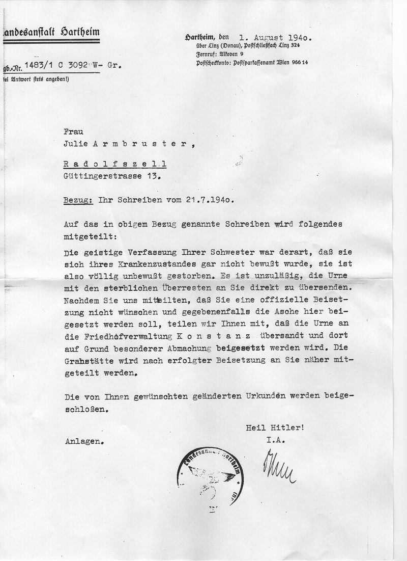 Die Angehörigen in Radolfzell erhielten die Todesnachricht (Schema-„Trostbrief“) nach dem 7. Juli 1940 zusammen mit zwei Sterbeurkunden von der „Landesanstalt Hartheim“ bei Linz. Eingetragenes Todesdatum: 6. Juli 1940; fingierte Todesursache „Wurmfortsatzentzündung / Bauchfellentzündung“. Es handelt sich bei diesen im Original durch die Familie überlieferten Dokumenten um Schriftstücke, die die gängige Praxis des „Aktentauschs“ („Papierverlegung“) unter den Tötungsanstalten und damit die strategische Verschleierung der Mordaktionen belegen. Von Grafeneck wurden in Fällen des Akentauschs die Akten der in Grafeneck Ermordeten an eine andere „T4“-Vernichtungsanstalt, in diesem Fall nach Hartheim geschickt und die dortige Verwaltung angewiesen, je einen „Trostbrief“ und zwei Sterbeurkunden für die Angehörigen auszustellen. Sofern von den Angehörigen gewünscht, wurde danach sogar eine entprechend beschriftete Urne (mit unbekanntem Inhalt) aus Hartheim an die zuständige Friedhofsverwaltung im Wohnort der Angehörigen versandt. Bei Frieda Armbruster wünschten die Angehörigen offenbar „keine offizielle Bestattung“ und baten mit Schreiben vom 21. Juli 1940, die sterblichen Überreste in Hartheim begraben zu lassen, woraufhin am 1. August 1940 ein Hartheimer Büroleiter oder Tötungsarzt („Dr. Hell“) antwortete, dass dies nicht möglich sei; ebenso wenig wie eine direkte Übersendung der Urne an die Angehörigen; man werde sie deshalb - wie offenbar geschehen - zur Beisetzung an die Friedhofsverwaltung Konstanz schicken. Warum diese Urne in Konstanz dann aber nicht bestattet und „vergessen“ wurde und wo man die Asche von Frieda Armbruster 1940 beseitigte, ist nicht bekannt.