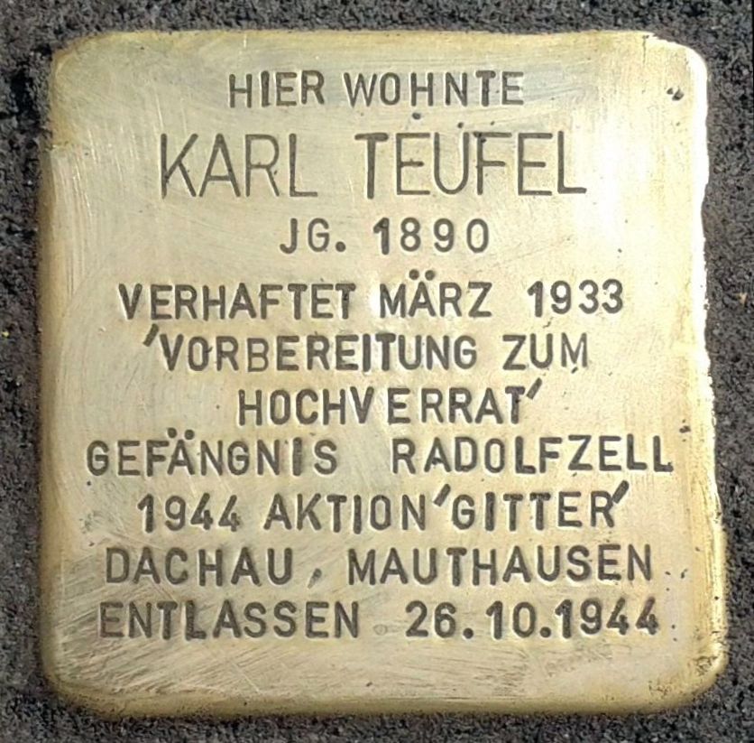 Der am 18. November 1890 in Willstätt geborene, am 25. Juni 1964 in Singen gestorbene Karl Teufel lebte zur Zeit der ersten NS-Verfolgungsmaßnahmen 1933 in Radolfzell, Dr.-Joseph-Goebbels-Str. (=Konstanzer Str.) 30/1, und ab 1938 in Überlingen am Ried. Karl Teufel war seit 1913 mit Rosa Bohnenstengel (1893-1981) verheiratet und hatte drei Kinder. Als Elektromonteur arbeitete er bei Allweiler in Radolfzell und ab 1939 bei Fahr in Gottmadingen.