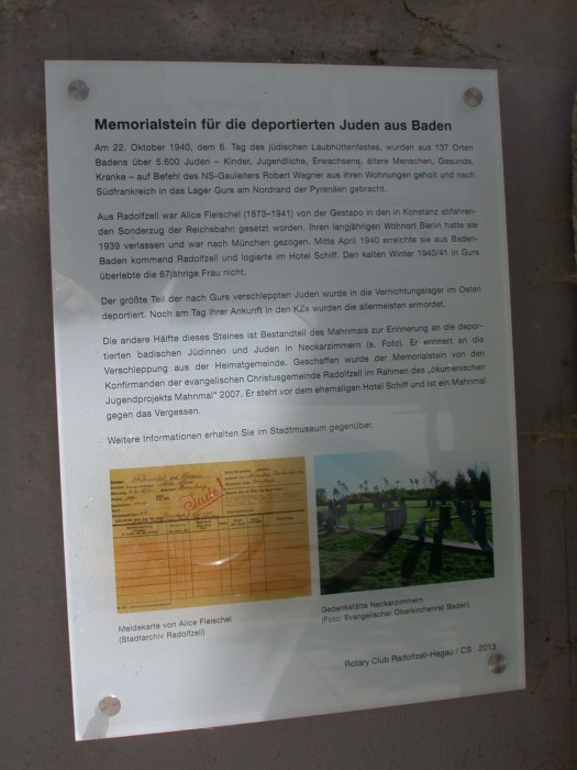 Im Juni 2013 wurde diesem bislang kommentarlosen und nicht von selbst verständlichen Gedenkstein eine vom Rotary Club Radolfzell-Hegau gestiftete Bild- und Texttafel hinzugefügt (Text: Christof Stadler), die Alice Fleischel namentlich nennt und ihre Deportation von Radolfzell nach Gurs erläutert.
