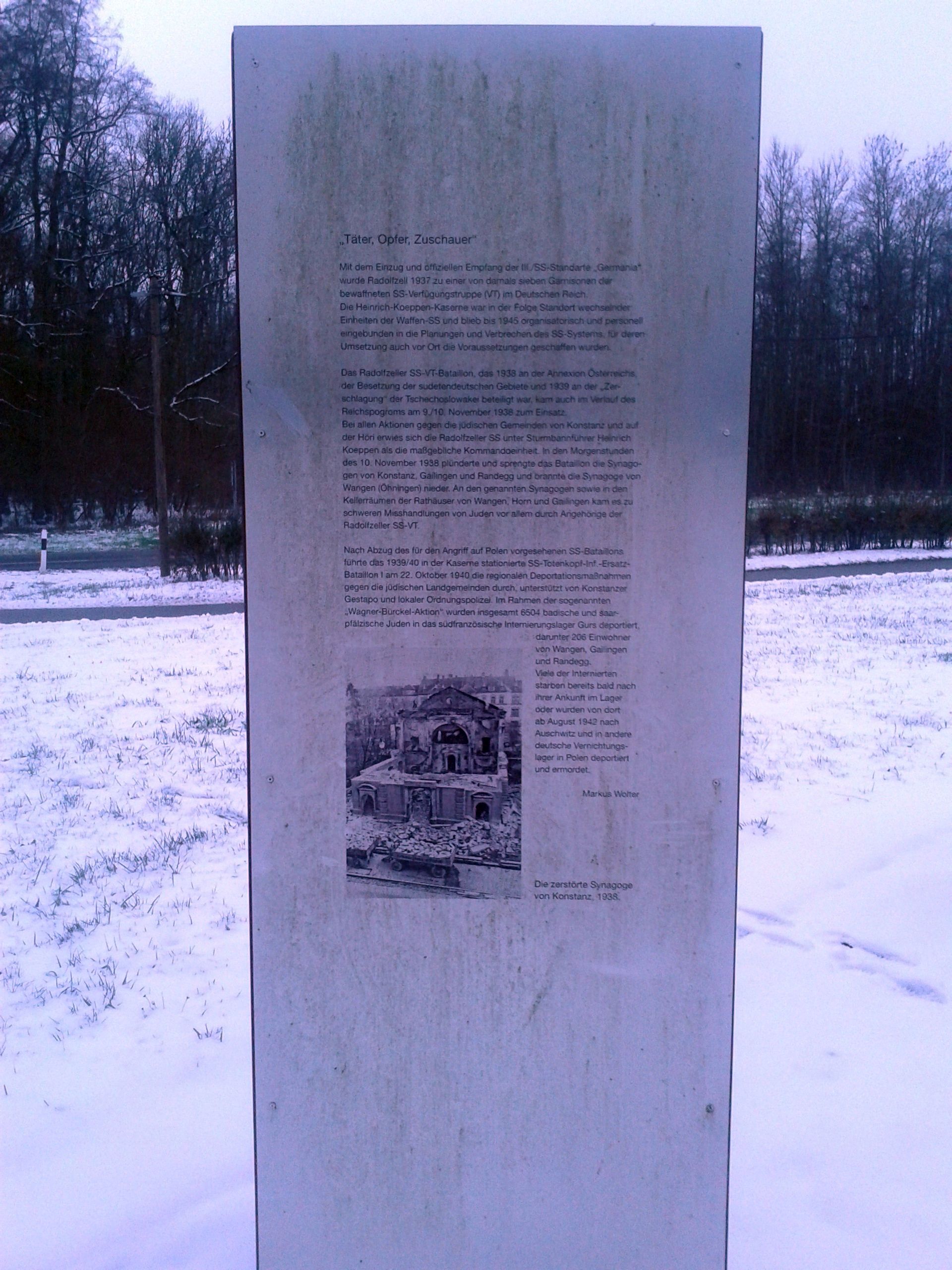 Der Radolfzeller Gemeinderat hat sich in seiner Sitzung vom 11.10.2011 für die Realisierung eines Entwurfs des PforzheimSS-Kaserne und KZ-Außenkommando Radolfzell er Künstlers René Dantes (geb. 1962) zur Gestaltung einer „Erinnerungsstätte“ an der Kaserne (Errichtung voraussichtlich 2012) mehrheitlich entschieden. Die Kosten (EUR 10.000 für vier Informations-Stelen und EUR 30.000 für eine Edelstahl-Skulptur) werden von der Stadt getragen.1
