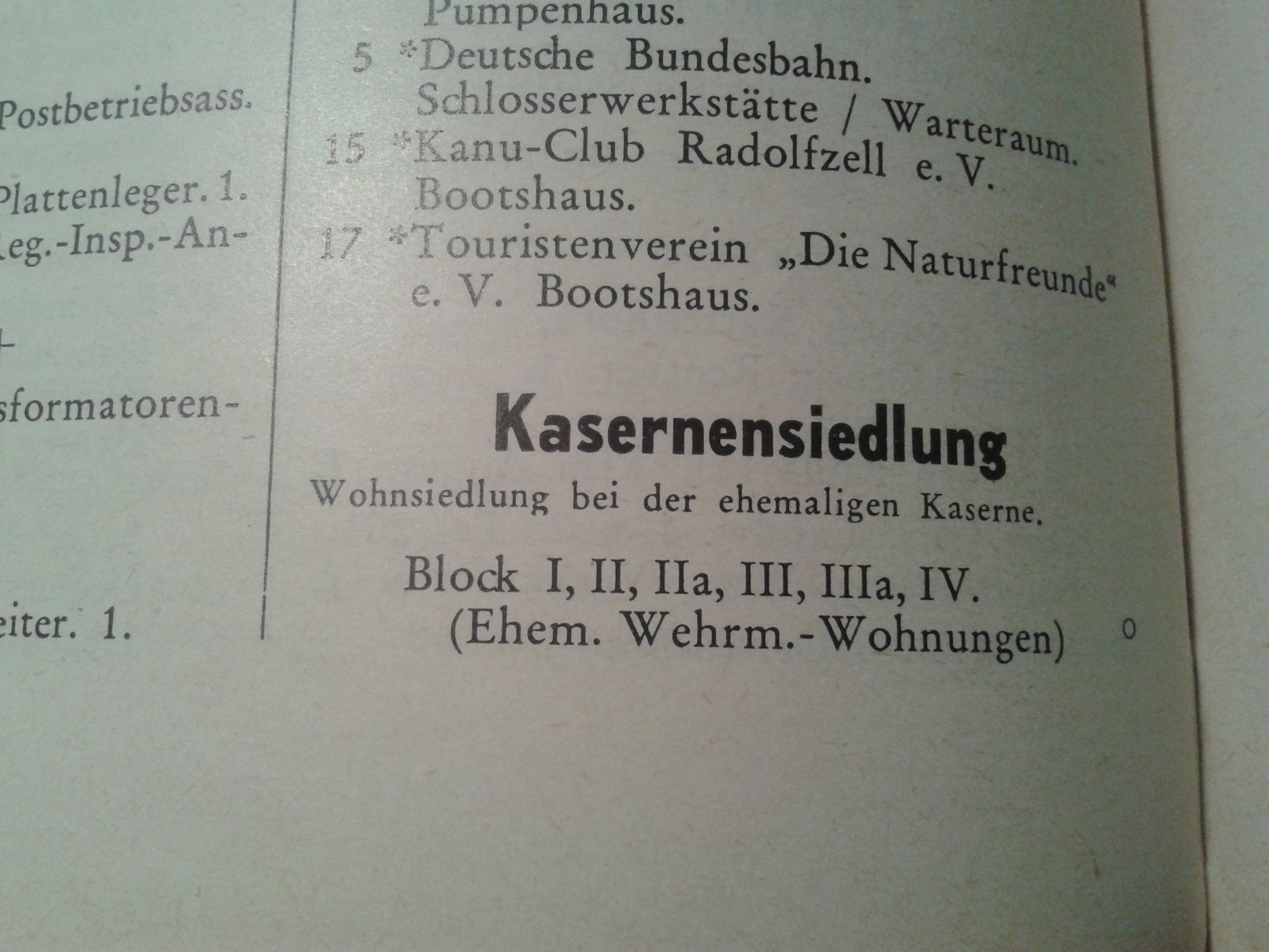 „Ehem. Wehrm.-Wohnungen“(!). Einwohnerbuch der Stadt Radolfzell, Konstanz, Stadler 1952.