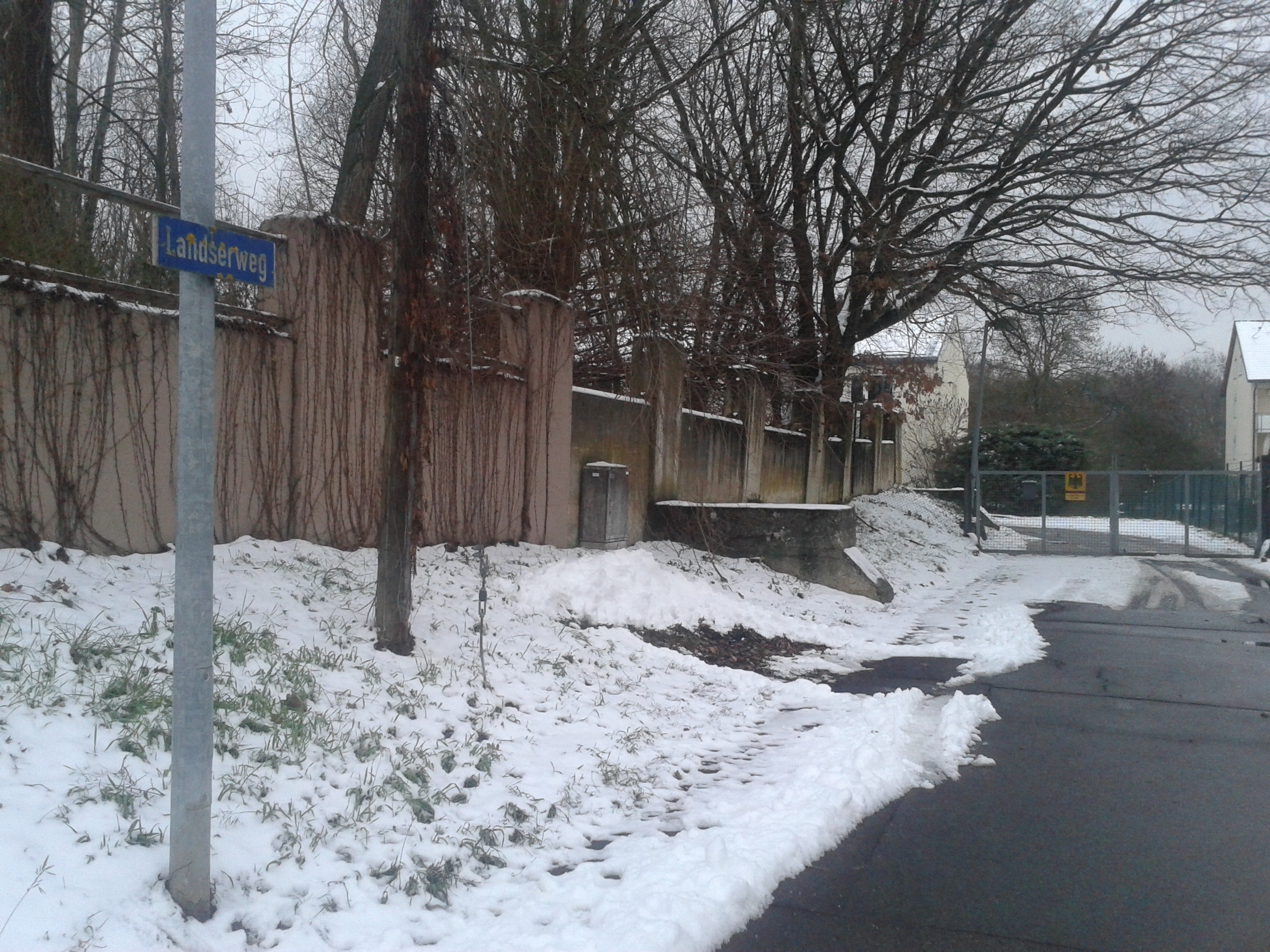 Der Landserweg. Links die alte Kasernenmauer, rechts die ehemalige SS-Wohnsiedlung.