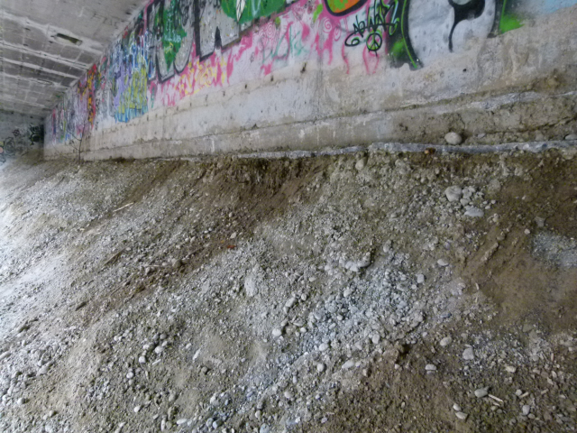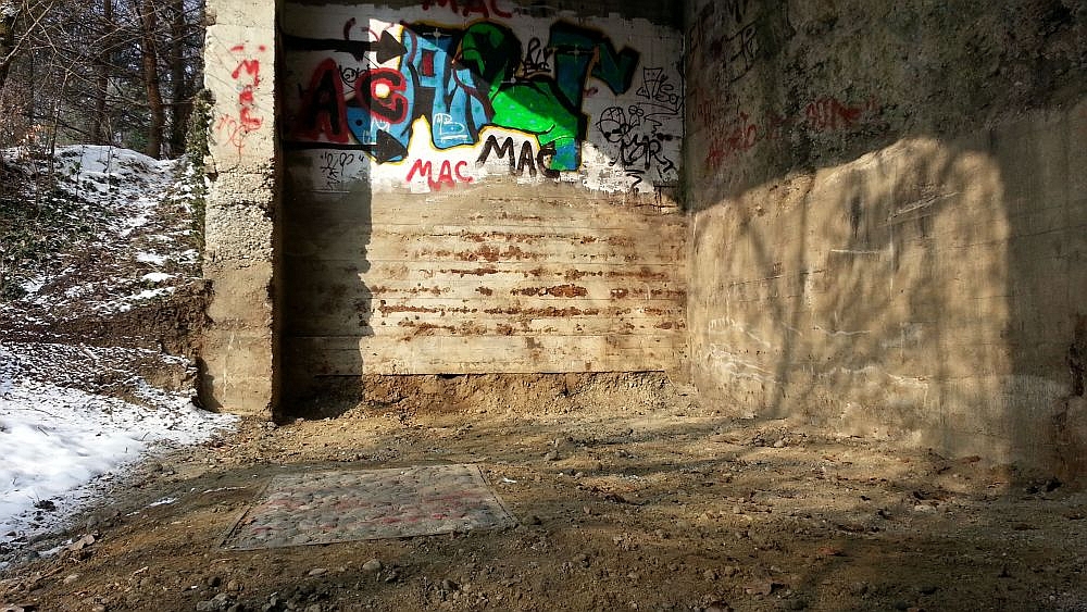 Nach Entfernung der Holzverkleidung und nach Aushub der Kugelfangsande, Februar 2013:
