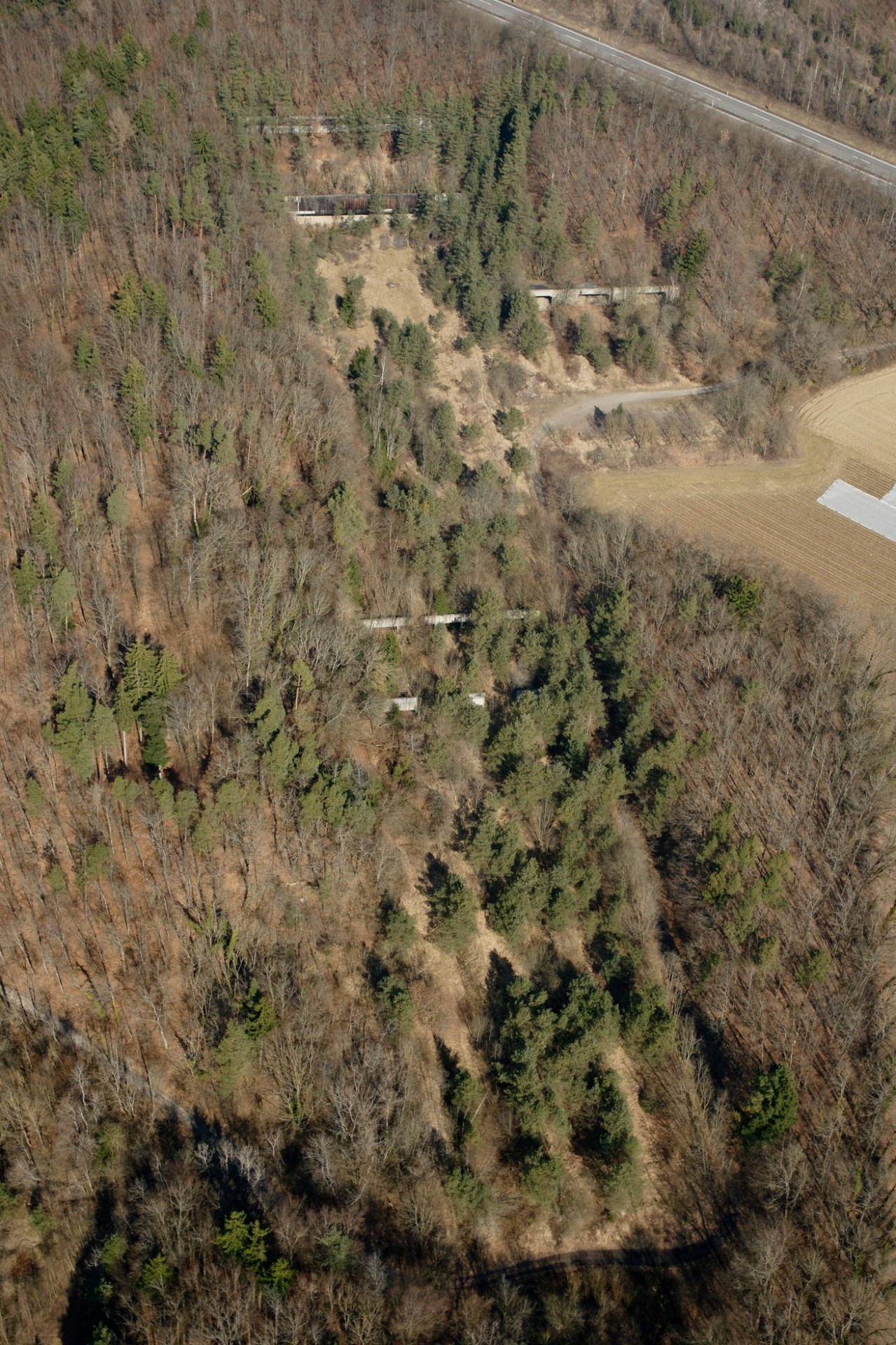 Der SS-Schießstand mit Munitionsdepot, vor dem Abzug der SS im April 1945. Luftaufnahme des US-Militärs, Provenienz unbekannt.