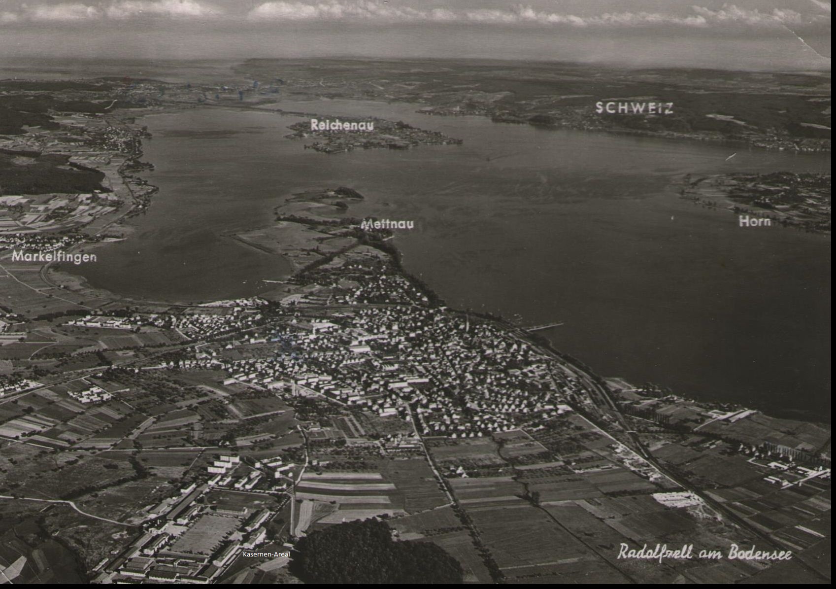 Radolfzell mit dem Kasernenareal (links unten), um 1958. Thorbecke Luftbild, Sammlung Markus Wolter.