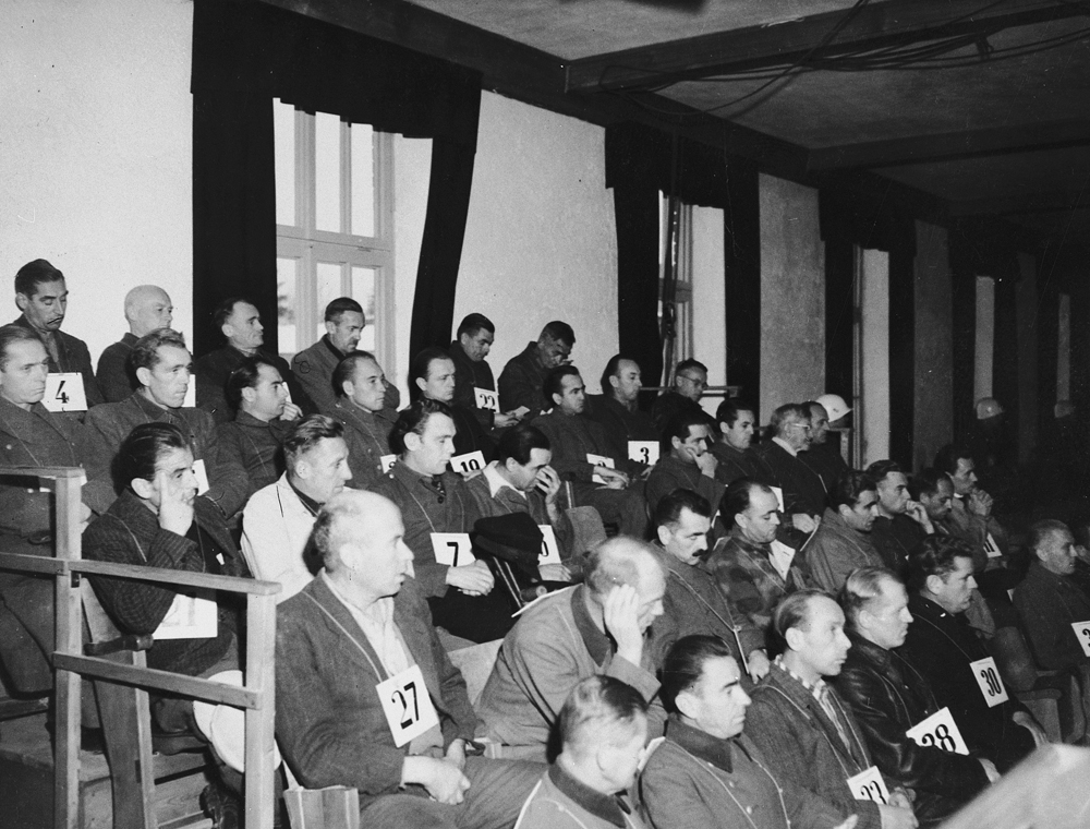 Die 40 Angeklagten im Dachau-Hauptprozess, November 1945.