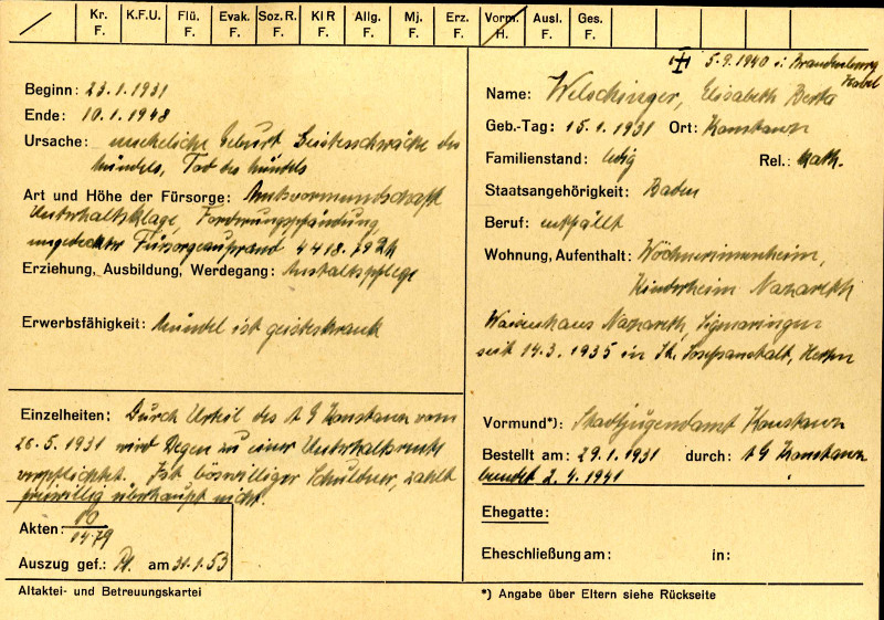 Karteikarte des „Mündels“ Elisabeth Welschinger, Zentralkartei Sozial- und Jugendamt Konstanz