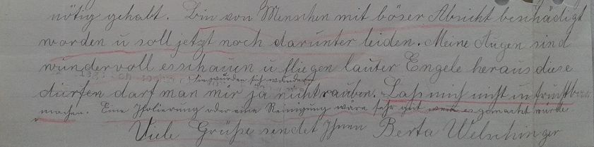 | Geisingen, den 22 April 1934. Sehr geehrte Amtsherren! Gebenedeit ist die Frucht deines Leibes. Das Schreiben erhalten. Nach meiner Gesinnung finde ich die Unfruchtbarmachung für höchst ungerecht. Alles Vergangene war sehr verdrießlich, möchte nun wissen, was man mit uns noch alles anfangen will. Wegen dem Kindersegen braucht man sich doch nicht unfruchtbar machen lassen. Alle fruchtbaren Mütter sind von Gott bestimmt in den Kindergarten. Wer will denn uns verdammen, verstoßen oder hassen wegen dem Kindersegen, das schönste und höchste Glück auf Erden. Traurig ist es, dass man uns Mütter einfach in eine Anstalt steckt und die Kinder einfach weggenommen werden. (Nachtrag: Schicken Sie mich bald heim. Gedenken Sie unserer unglücklichen Angehörigen. Gedenken Sie ebenfalls der armen Kinder auf dem Geisingerberg.) Gottes Wille ist, daß eine jede Mutter ihr Kind auf den Armen trägt. Aus dem Schreiben habe ich gesehen, betreffs dem Gutachten der Heil- und Pflege Geisingen, sie wollen mich noch beschränkt machen. In manchen Fällen kann ich noch ganz gut arbeiten. Würde mich ganz gerne in eine Bügelstube setzen, womöglich eine Stellung, in welcher man den Zahltag mitbringen muss. Wenn das so weiter geht, dann besitze ich bald kein eigenes Hemd. Sollten diese mich beschränkt machen, so will ich Sie darauf aufmerksam machen wegen dem Selbstversorgen; habe überhaupt vorher keine Anstalt und keine Fürsorge nötig gehabt. Bin von Menschen mit böser Absicht beschädigt worden und soll jetzt noch darunter leiden. Meine Augen sind wundervoll; es schauen u. fliegen lauter Engele heraus. (Sie würden sich wundern.) Diese darf man mir ja nicht rauben. Lass mich nicht unfruchtbar machen. Eine Isolierung oder eine Reinigung wäre sehr gut, wenn es gemacht würde. Viele Grüße sendet Ihnen Berta Welschinger. |