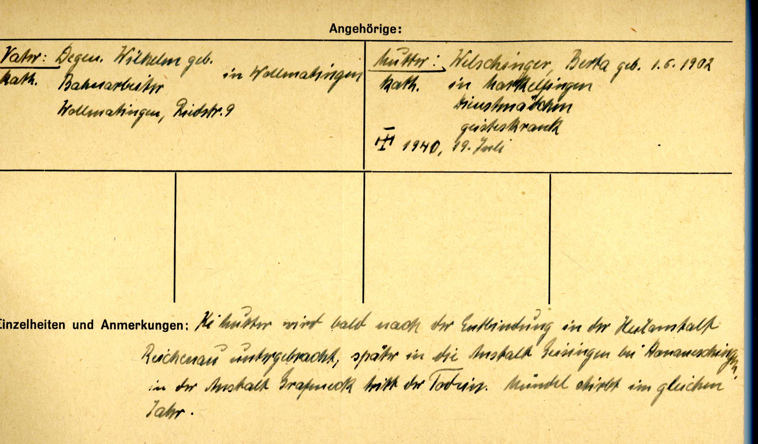 In der Familie erzählte man sich zwar, dass Berta Welschinger vor Einweisung in die Reichenauer Anstalt 1931 ein Kind entbunden habe; dessen Name und weiteres Schicksal waren den heute lebenden Angehörigen jedoch nicht mehr bekannt gewesen.