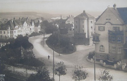 Luisenplatz mit Realschule (seit 1908), Scheffel-Denkmal (seit 1891) und Gefängnis (genannt „Café Achteck“), zeitgenössische Ansichtskarte, um 1915.