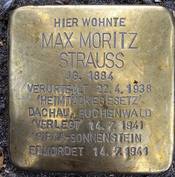 Nach der Deportation ihres Mannes ins KZ ließ sich Else Strauss überreden, die Scheidung einzureichen, um weitere Benachteiligungen für sich und Tochter Erika zu vermeiden. Strauss verlor damit jeglichen Schutz, den sein Status als jüdischer Partner in einer sogenannten Mischehe bis dahin noch bedeutet hatte. Im Rahmen der "Aktion 14f13" wurde Strauss am 14. Juli 1941 in die NS-Tötungsanstalt Pirna-Sonnenstein transportiert und noch am selben Tag in der Gaskammer ermordet. Seit dem 13. Juli 2018 erinnert in der Ulmer Schwörhausgasse 15 ein Stolperstein an Moritz Max Strauss.11