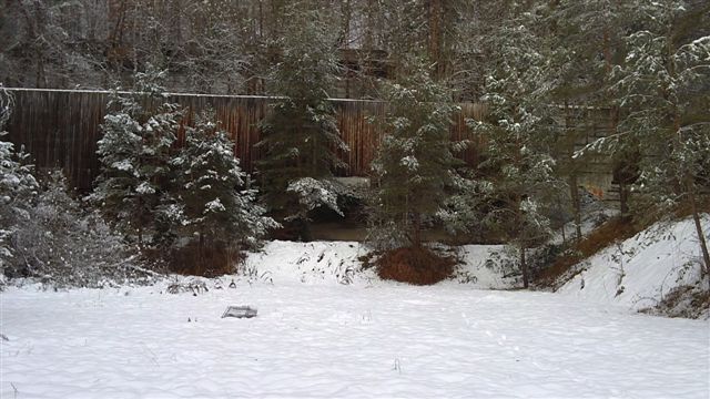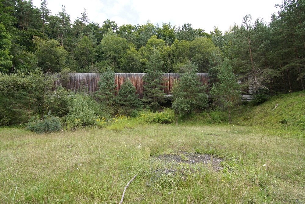 Holzverkleideter Beton-Kugelfang am Ende der drei Langbahnen (Blick nach Norden), 2011: