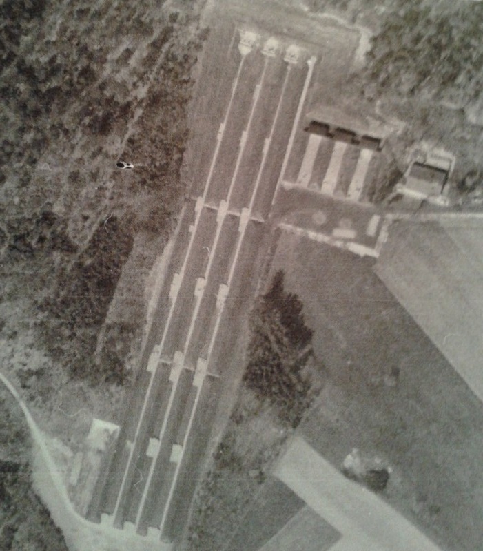 Der SS-Schießstand mit Munitionsdepot, vor dem Abzug der SS im April 1945. Luftaufnahme des US-Militärs, Provenienz unbekannt.