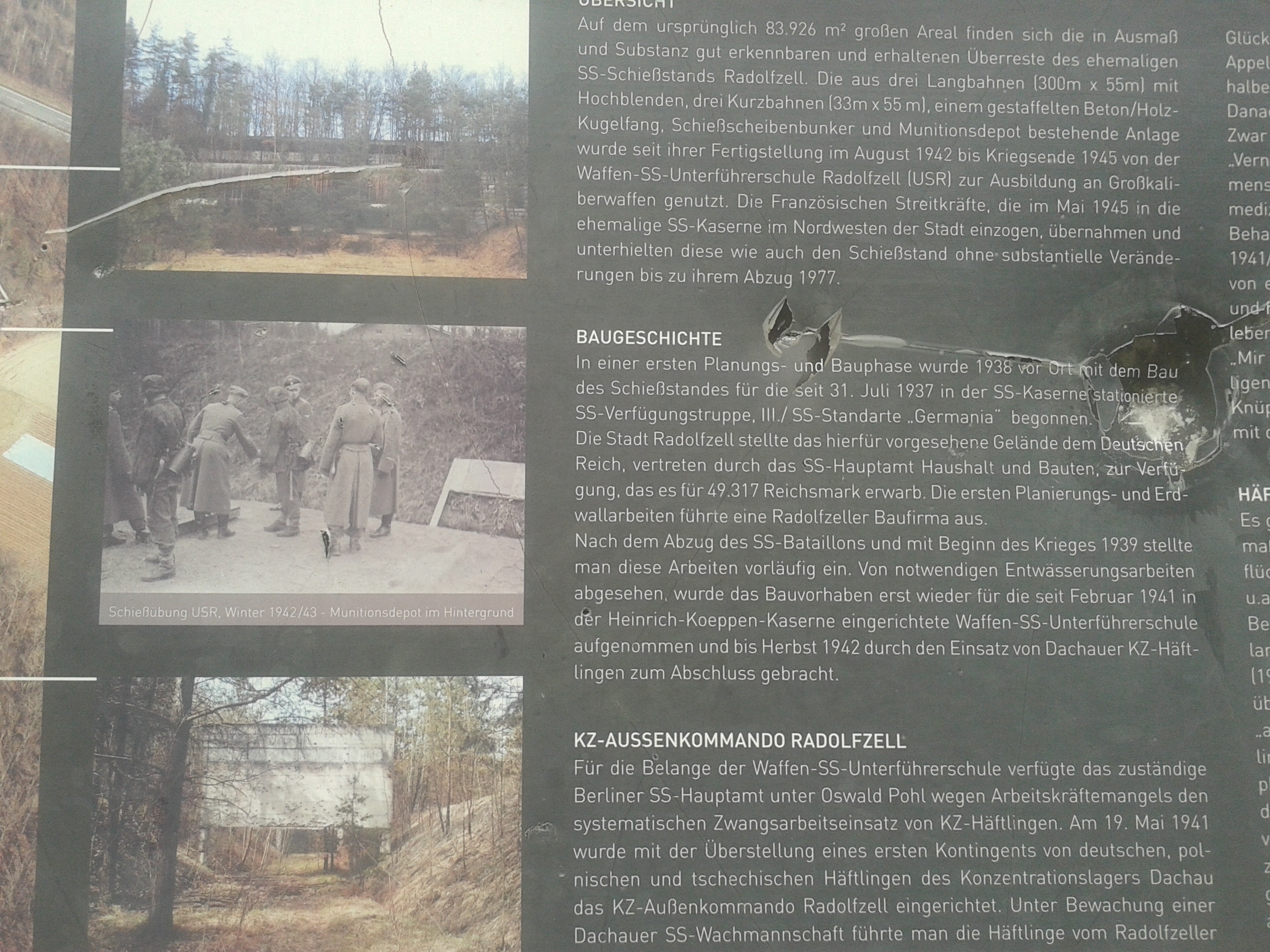 Der im Nordosten von Radolfzell gelegene ehemalige SS-Schießstand wurde in den Jahren 1941 und 1942 unter Einsatz von 120 KZ-Häftlingen aus Dachau fertiggestellt. Er wurde in der Folge von Waffen-SS-Einheiten der Radolfzeller Unterführerschule für das Erlernen ihres mörderischen Handwerks genutzt.