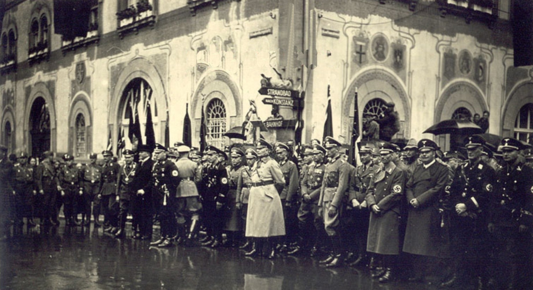 Empfang am Rathaus. Erste Reihe, 6. v. links: Bürgermeister Josef Jöhle (in Parteiuniform und mit Amtskette), rechts daneben: Landeskommissär Gustav Wöhrle (in Zivil), SS-Oberführer Walter Stein (schwarze SS-Uniform), Landrat Carl Engelhardt (abgewandt), n.n. (SS-Angehöriger), Egon von Groeneveld (im Mantel der Wehrmachtsuniform), SA-Standartenführer und Polizeimajor Cäsar Graf v. Beroldingen u.a. Fotografie: Vmtl. Paul Moriell oder Gotthard Liedl, StAR.