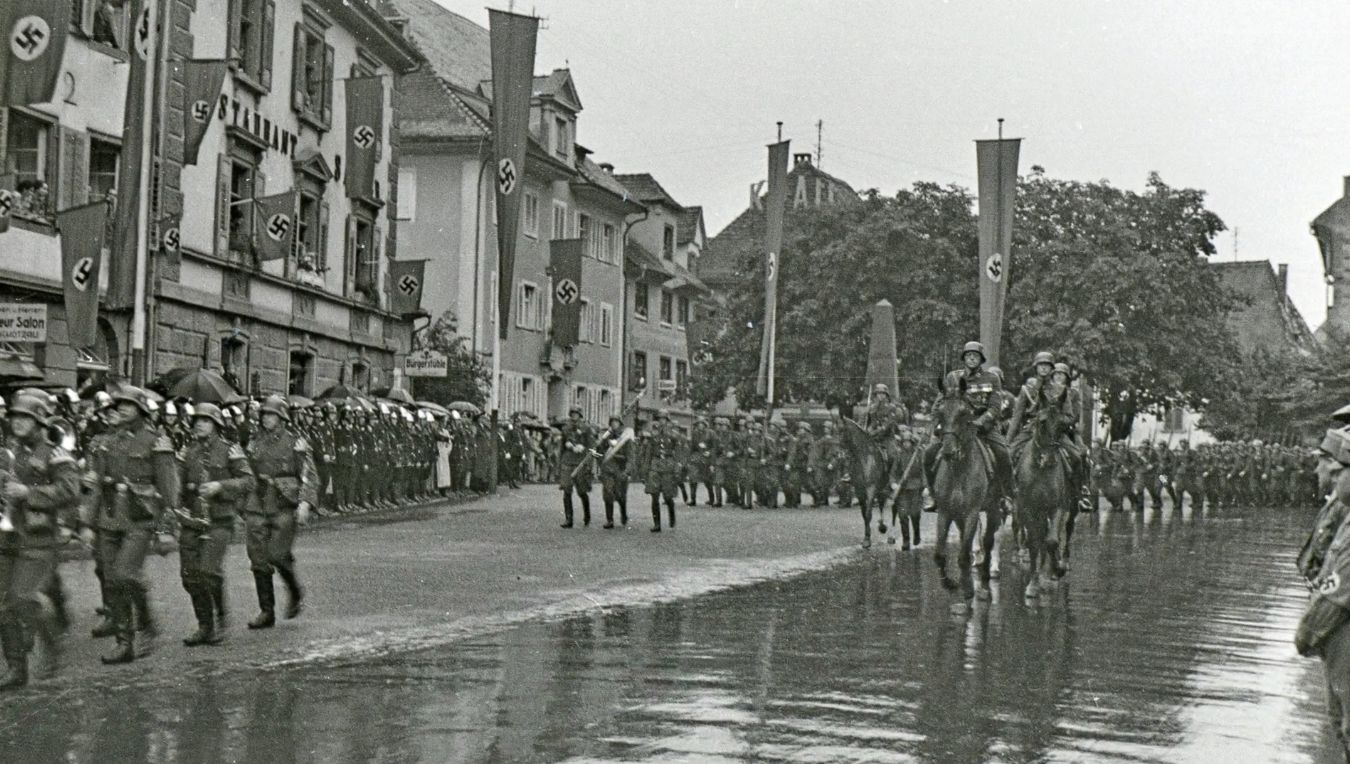 Begrüßung der SS-VT durch Bürgermeister Josef Jöhle; linke Seite: SA-Angehörige; rechts: SS-VT; Mitte: Landeskommissär Gustav Wöhrle; von hinten links, mit Degen: SS-Sturmbannführer Koeppen; auf dem Podest neben dem Rathaus: Bürgermeister Josef Jöhle (mit Amtskette). Blick vom Marktplatz in die Kaufhausstraße. Fotografie: Paul Moriell. Archiv G. Moriell.